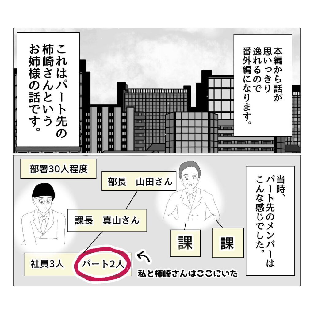 突然の番外編漫画。パート先のお姉様、柿崎(かきざき)さんの思い出です。全何話になるかはわからないのですが短編で終わる予定です。