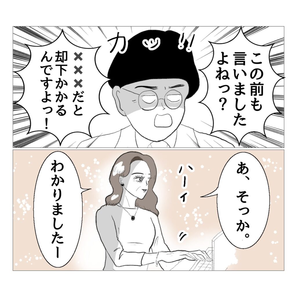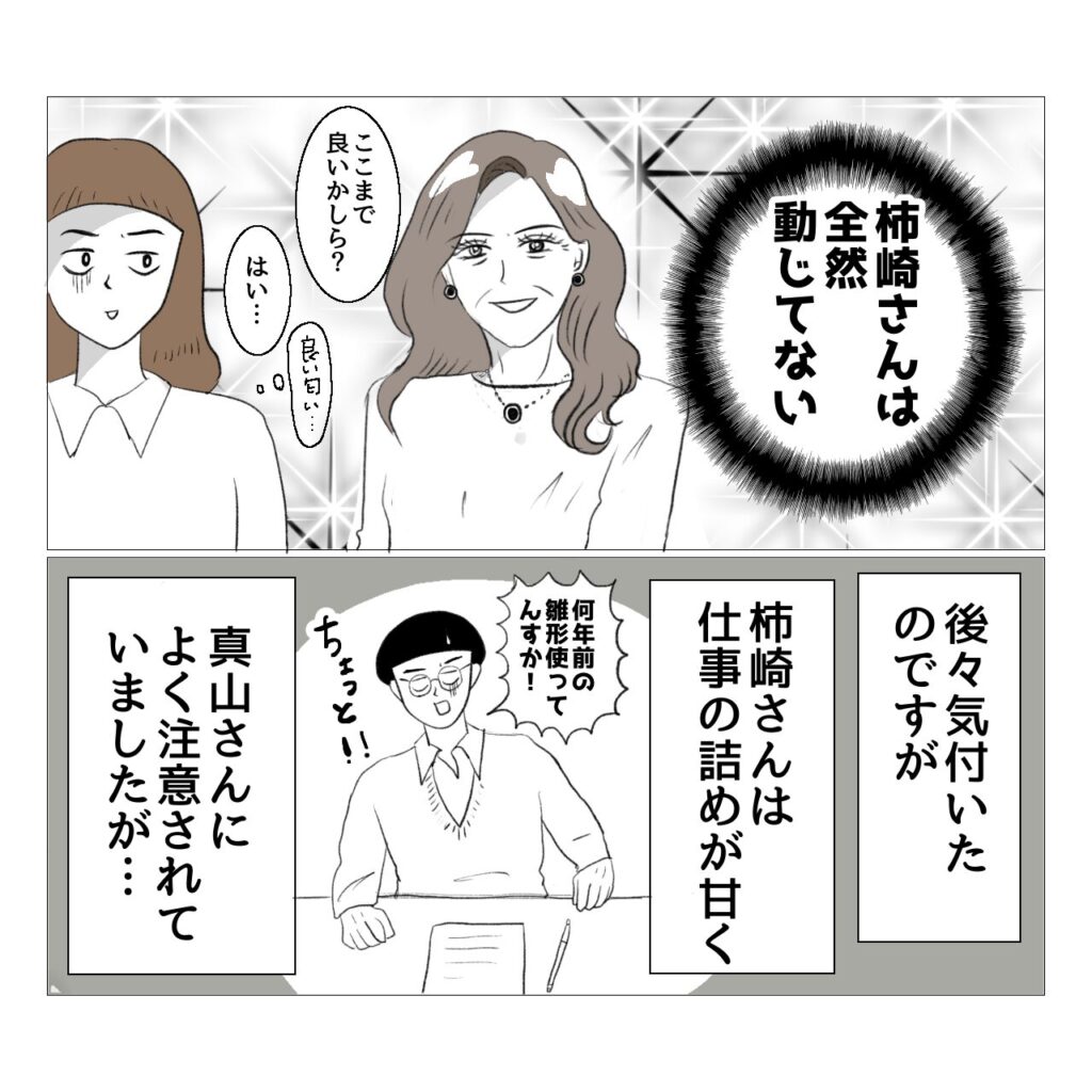ただ…柿崎さんは事務の仕事は本当にテキトーでした(;^ω^)上司の真山さんは、「仕事を普通にやってたまにミスしてしまう」くらいなら怒って注意するようなことはなかったのですが、柿崎さんに対してはいつもこんな感じで食ってかかっていました。当初私は、真山さんはすぐに怒る怖い人なのか…?と思って怯えていたのですが、しばらくして「あ…柿崎さんがテキトーだからこうなのか…」と気づいたのでした。