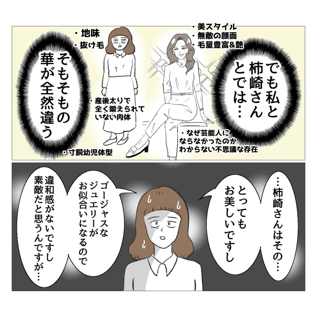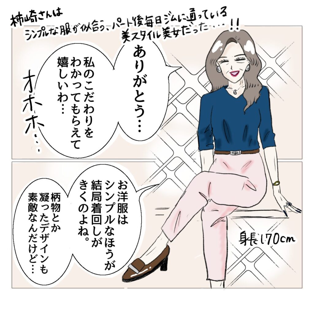 柿崎さんは身長が170㎝あり、お顔が小さくて足が長くてとてもお綺麗なスタイルでした。そして、顔面が最強でした。柿崎さんは平日毎日ジム通いされて努力して美しさを保っていらっしゃったのですが、それにしても、なんというか土台が全然違うんですよ。神さまは不公平だなと思いました。