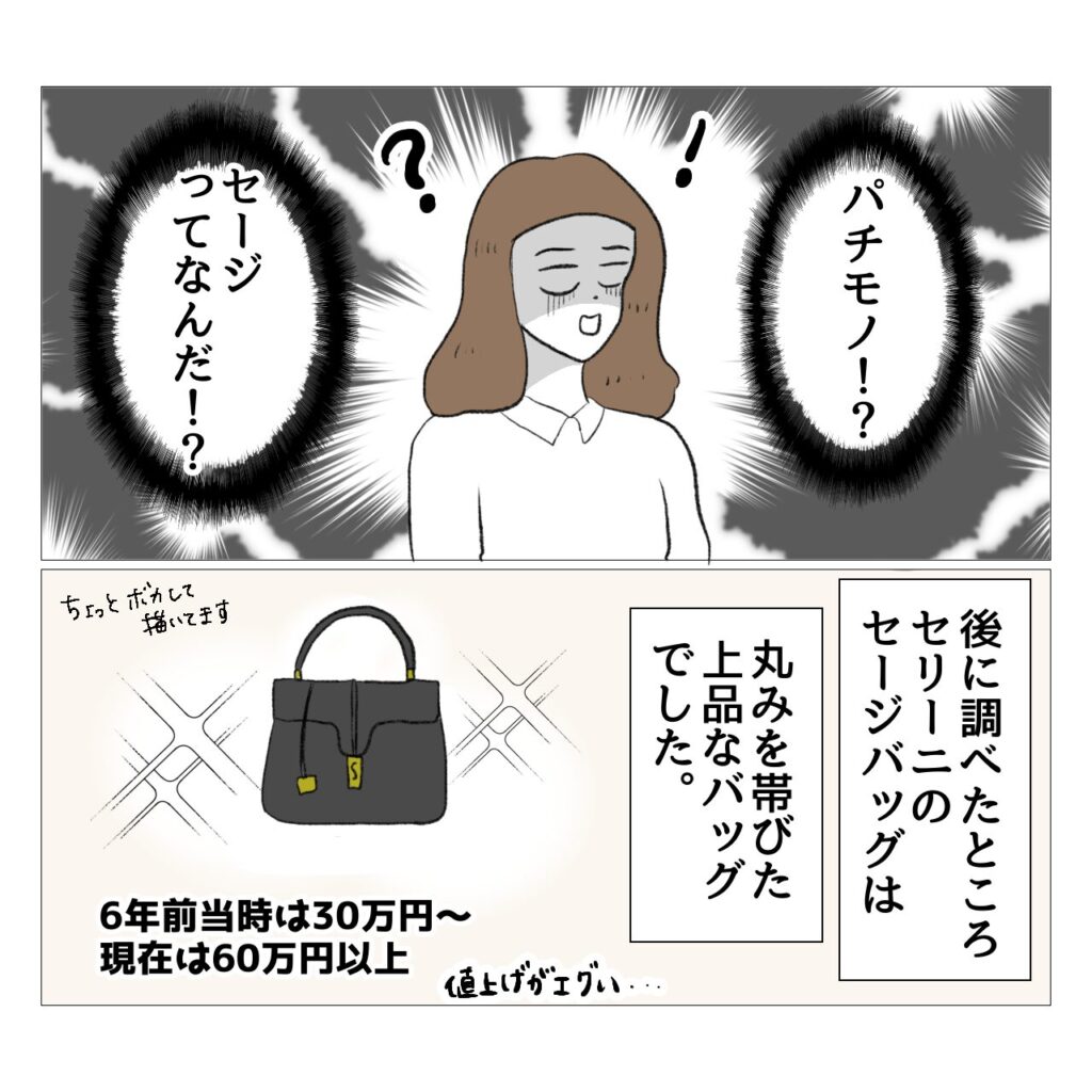 この時は結局セーズは買いませんでした。でもこの30万円台の時に買っておけばよかったなあと激しく後悔してるバッグです。これみよがしなブランド感がないけどおしゃれなデザインで、お出かけも式典系もいけますし、年齢問わず長く使えるデザインで…爆発的に流行ってるわけじゃないので流行り廃りもないですし…。でもまあ、買わなかったものは仕方ない。とりあえず柿崎さんの助言で模倣品を買わずに済んで、それは本当によかったです。