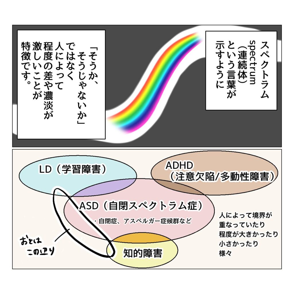 一方で、これらの障害では対人関係の難しさやこだわりの強さなど、共通した特性が認められます。そのため、別々の障害として考えるのではなく、虹のようにさまざまな色が含まれる一つの集合体として捉えようとするのが「自閉スペクトラム症(自閉症スペクトラム障害)」という考え方です。