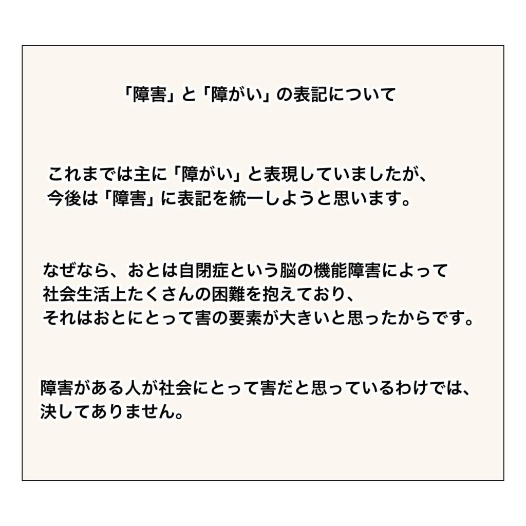 「障害」「障がい」「障碍」など表記が様々あり、どの表記が適切であるかずっと考えていました。これについては考えを書き出すと長くなるので、今度noteやブログでまとめたいと思っています。