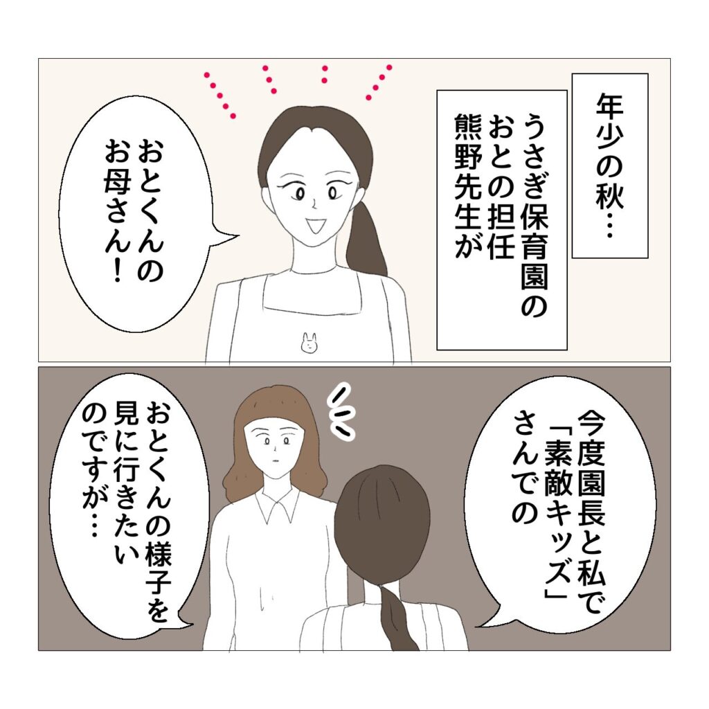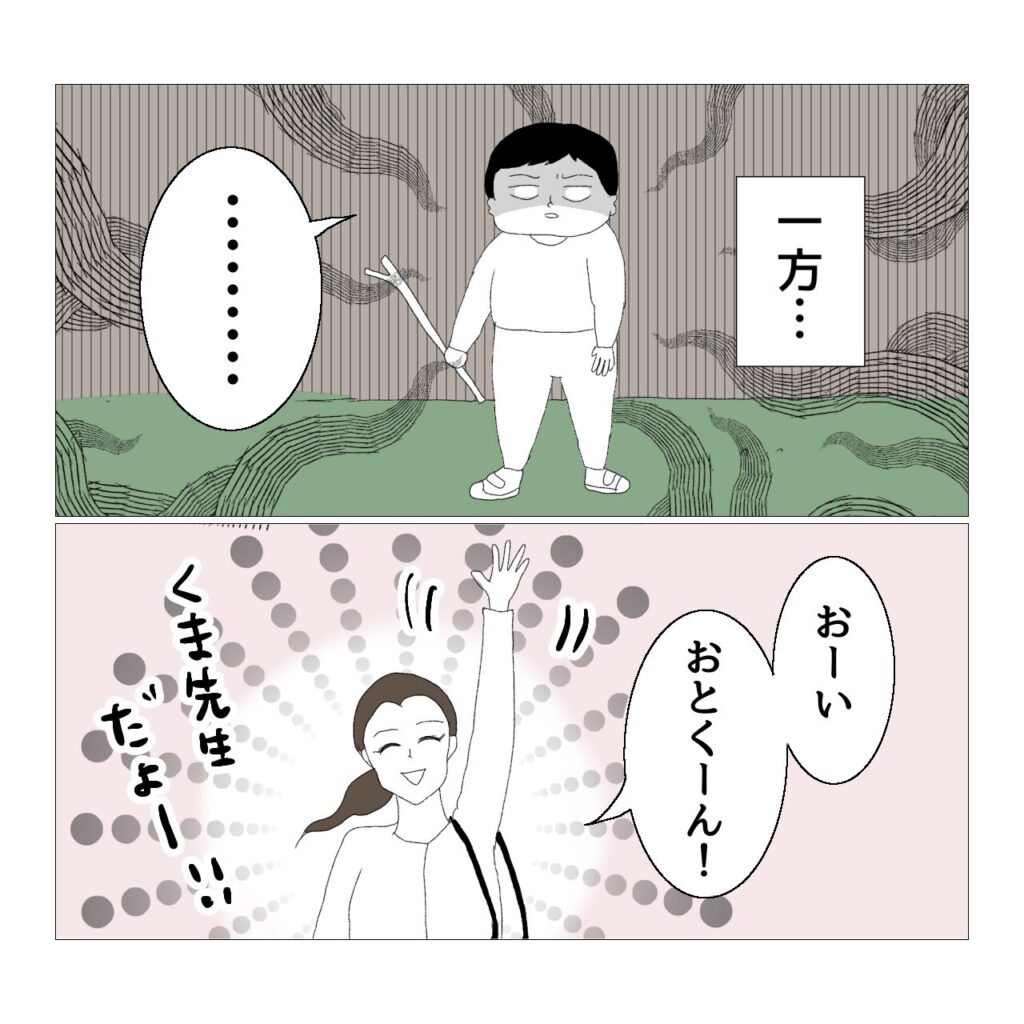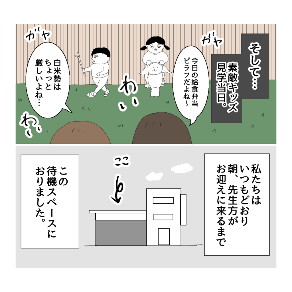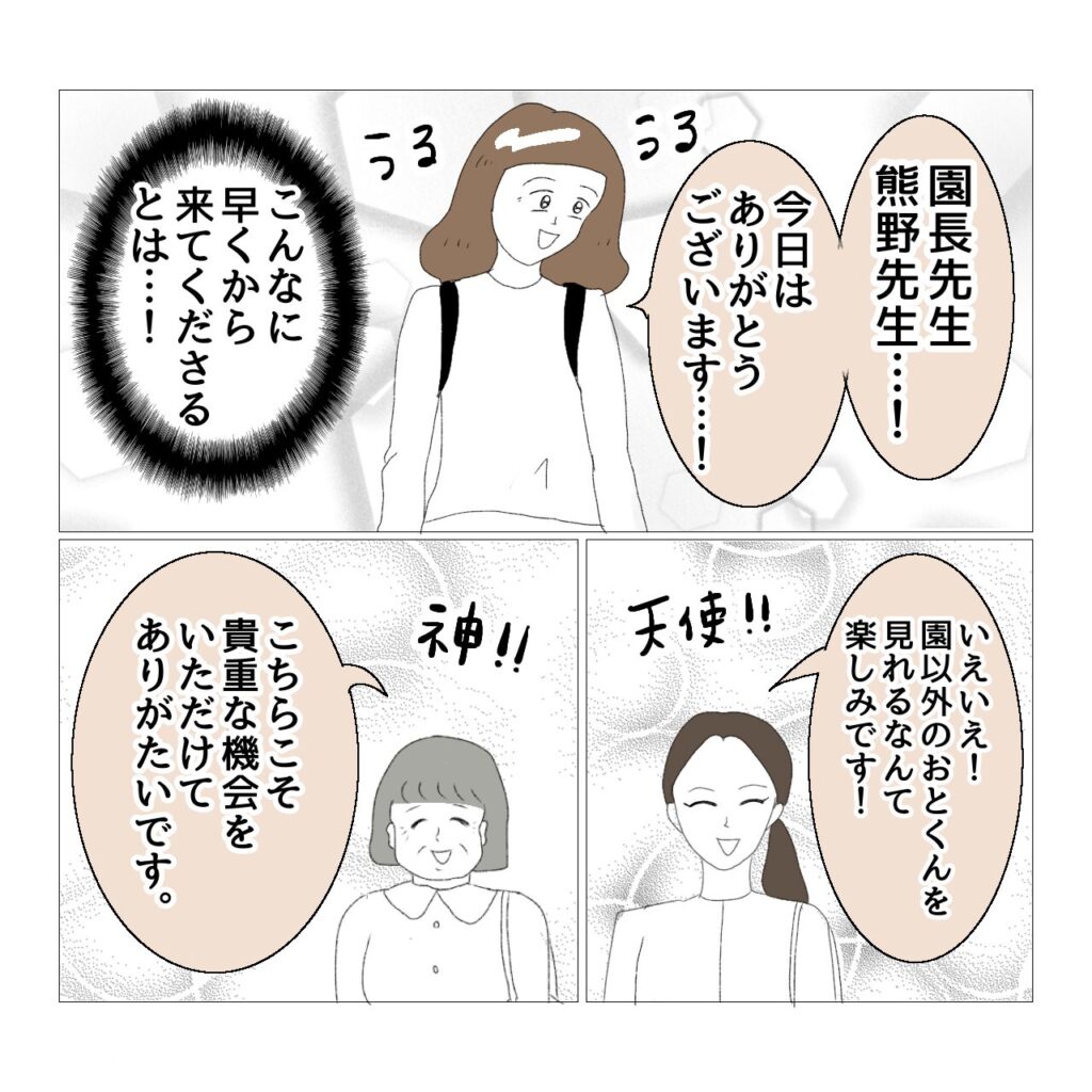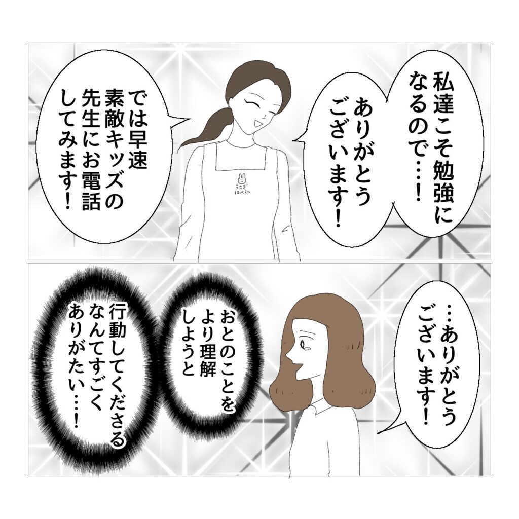 また、これは後日白鳥先生から雑談としてお聞きした話なんですが…。素敵キッズ側から「よかったら療育を見に来てくださいね。」と園側に声掛けをしても、ほとんど見に来る園はないとのことでした。園の先生方もお忙しいですものね…。なので、うさぎ保育園が自ら「見学したい」と言ってやって来た、ということに白鳥先生は驚いていらっしゃいました。しかも園長が直々に見学に来ることは初めてのことだったそうです。さらに以前漫画に描いたんですけど、我が家やうさぎ保育園から素敵キッズまで行くためには、徒歩・バス・電車で片道1時間かかるんですよ。わざわざ時間をかけて移動してきてくださったことが申し訳なく、でもとてもありがたかった出来事でした。