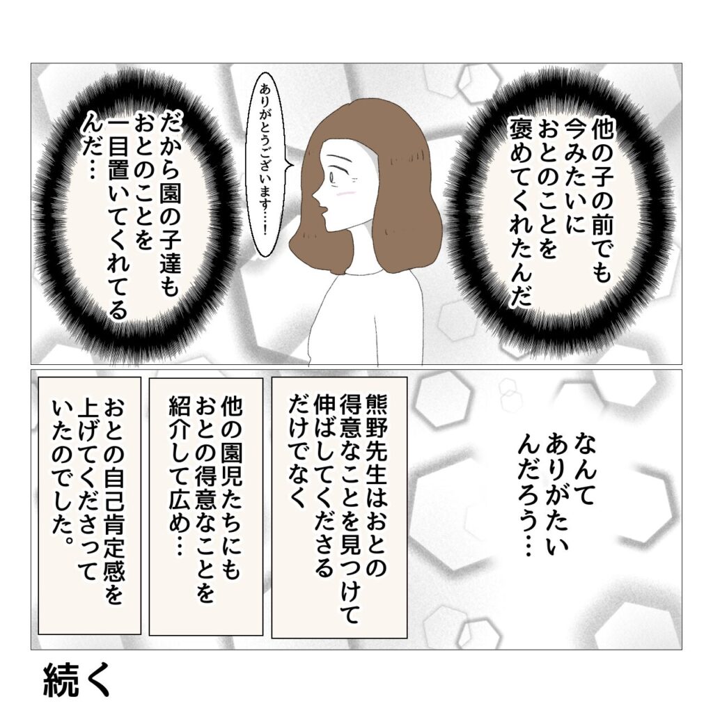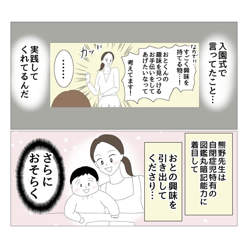 おとはASD児なので、もちろん先生方や他の園児を困らせてしまう場面もありました。でも熊野先生は小さなことでも私に報告してくださり、時には素敵キッズの先生に中に入っていただくなどして、一つ一つの問題を工夫して改善してくださいました。