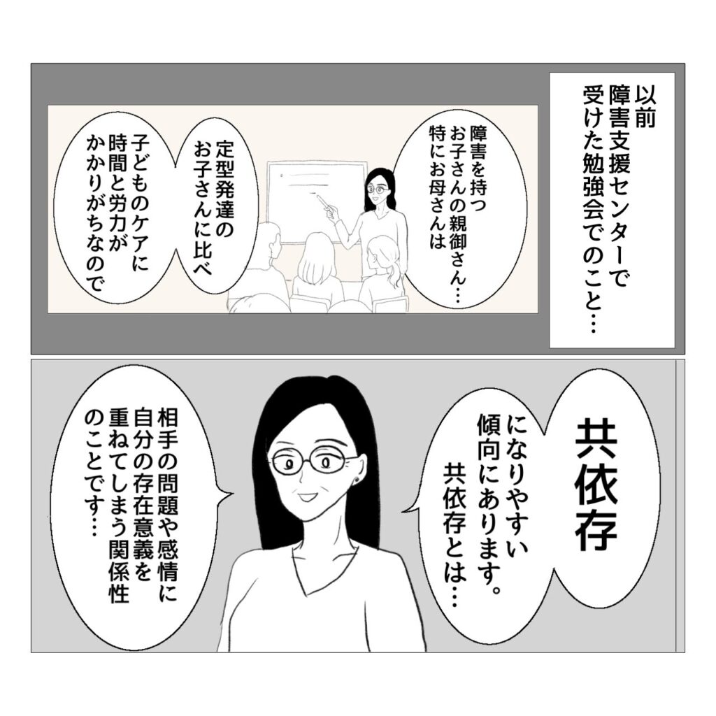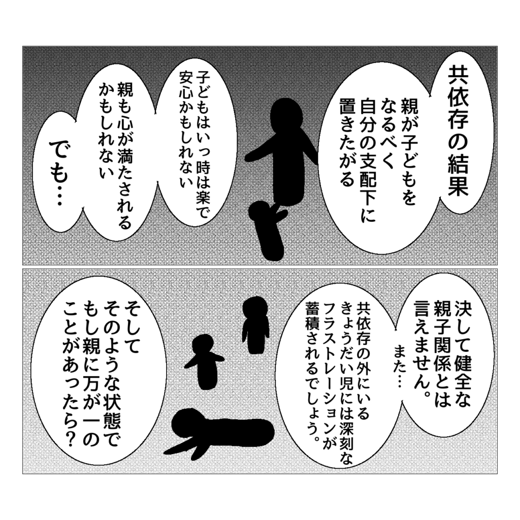 共依存は障害児とその親に限った話ではなく、わりと多くの人たちの日常にあることだと思います。距離感が近すぎたり精神的に不安定な親・友達・パートナー、DVモラハラ、アルコールやギャンブル等の依存症者とそれを過剰に支えてしまう家族、ブラックな職場、一部のキャバやホスト、一部の宗教、マルチ等々…