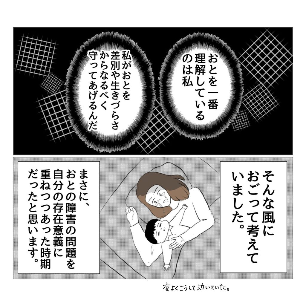 2歳時に、息子には強い自閉傾向があるという診断書まで受け取っていたにも関わらず「息子が親に愛着を示さないのは、本当は私の接し方が悪いからなのではないか…私ってダメ人間だ…」と思い悩んだり、一方で「私がおとのことを一番理解している!」と驕って考えたり「私がこの子を守る!!!」(無理だろ)と謎の正義感で夜中涙を流したりと、メンタルは大忙しでした。今思うとなんか…ちょっとおかしかったんですよね。