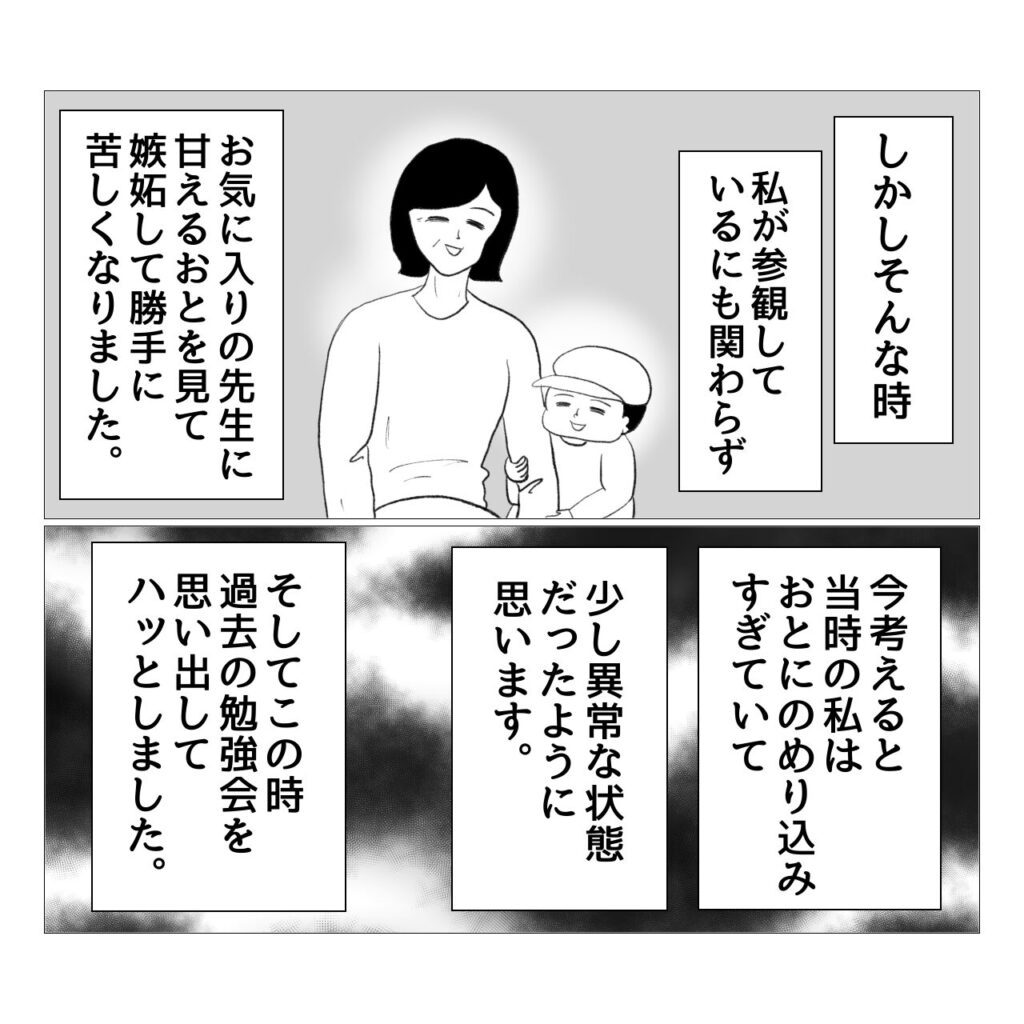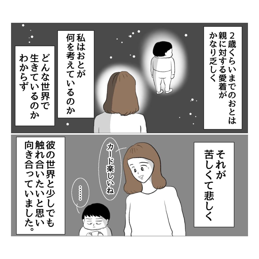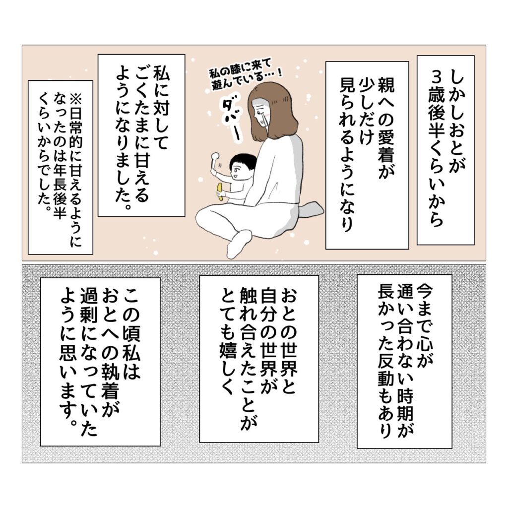 こんな精神状態だったため、八木先生に甘えてるおとを見て苦しくなったのでした。今思うと当時は療育、保育園、障害支援センター、OT、STに繋がっていて障害支援については恵まれた状況でした。さらに私は家から離れた場所でパートをしており、家庭以外の世界もありました。にも関わらずこのような状態になっていたので、自閉症児の持つ「親に対する愛着の薄さ」という特性は親、特に母親にとってそれだけ精神的なダメージが大きいものなんだろうな…と感じるのでした。