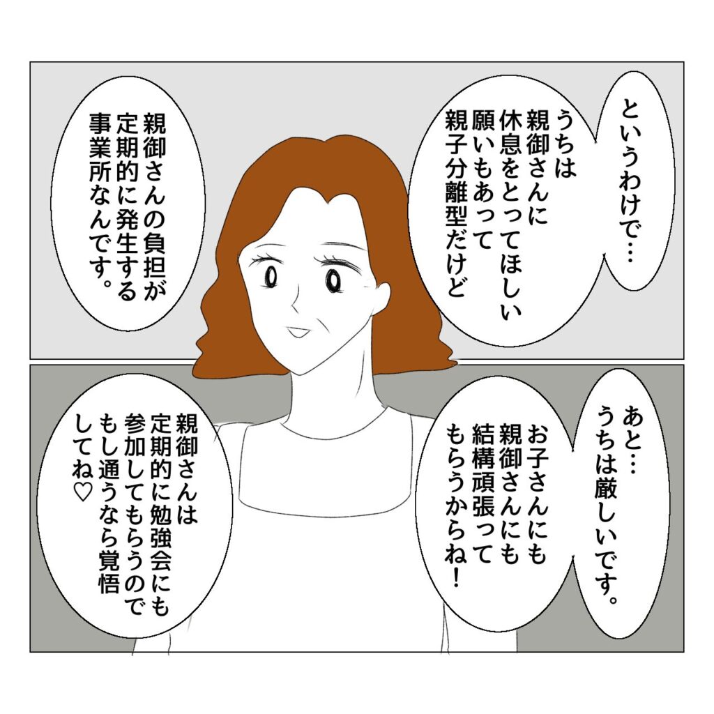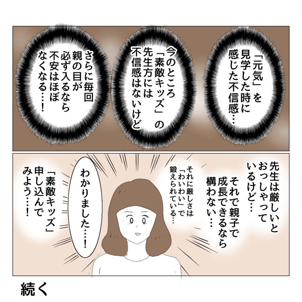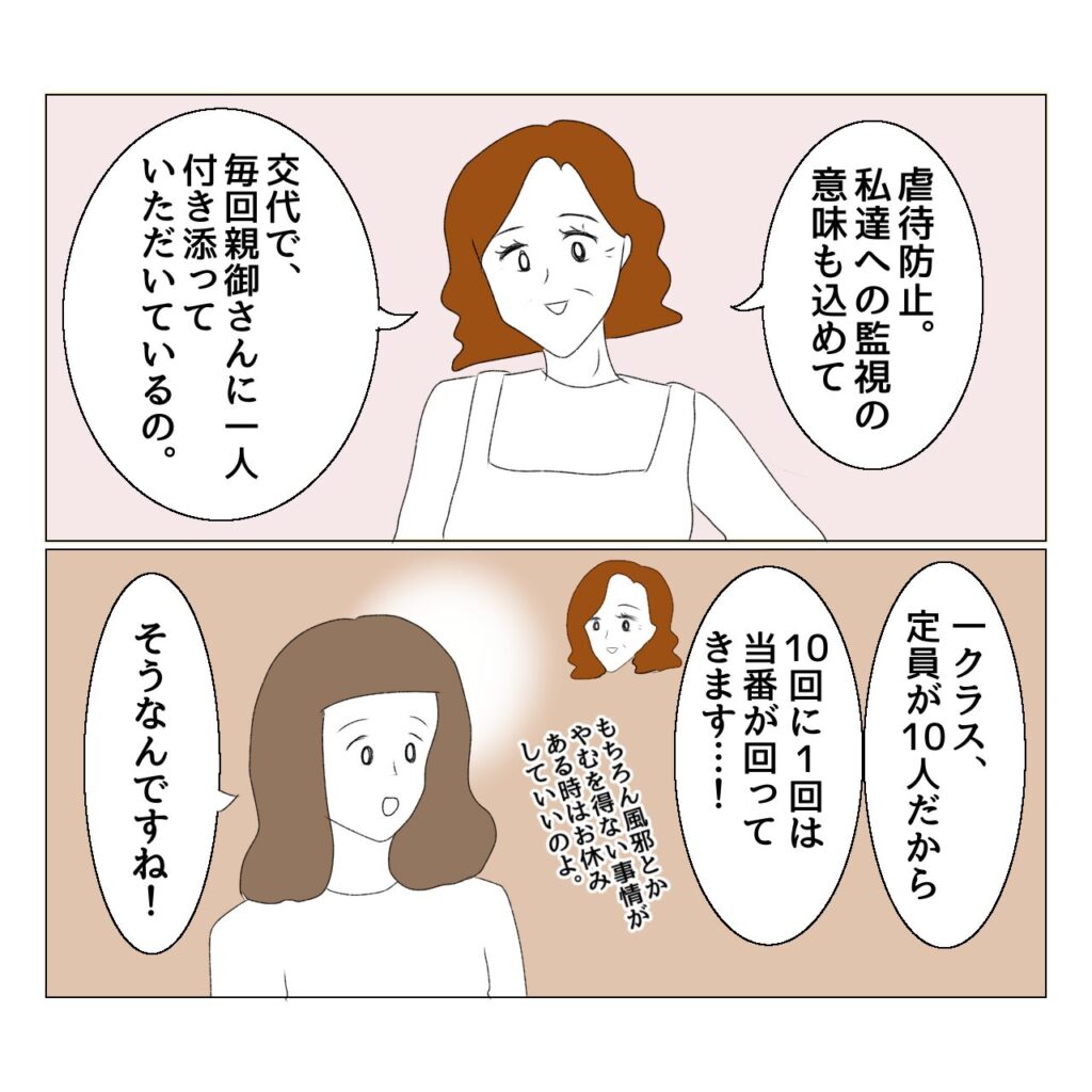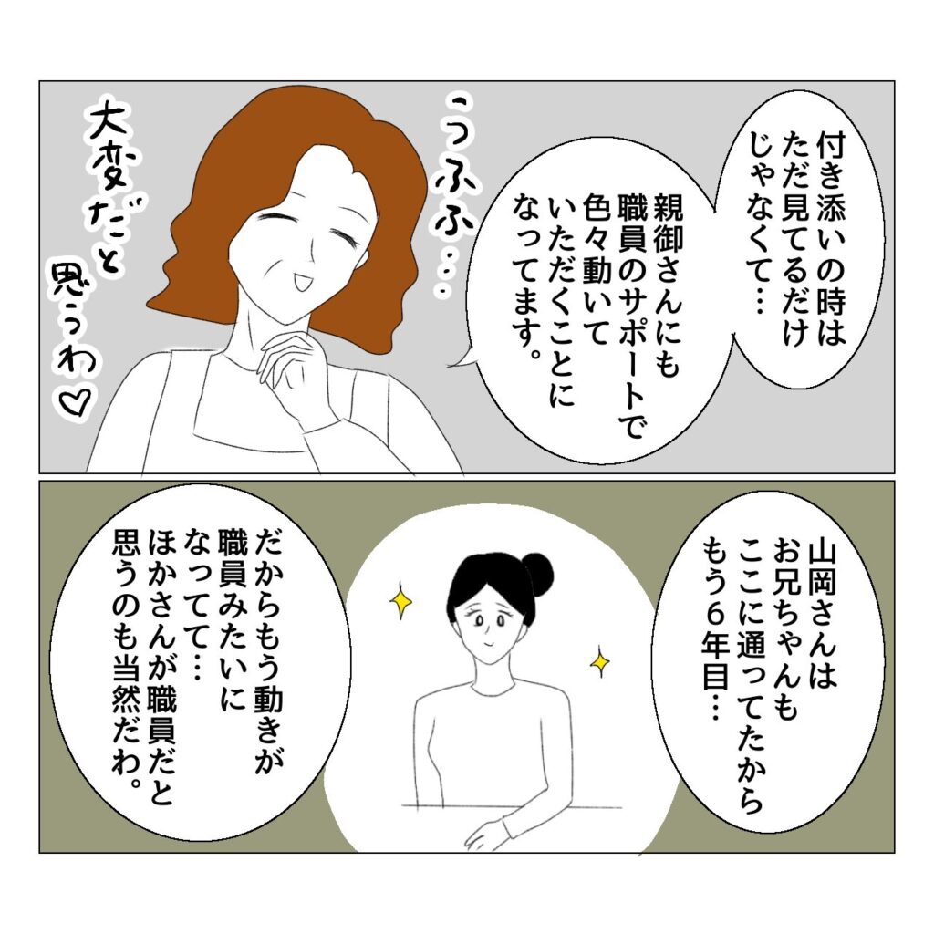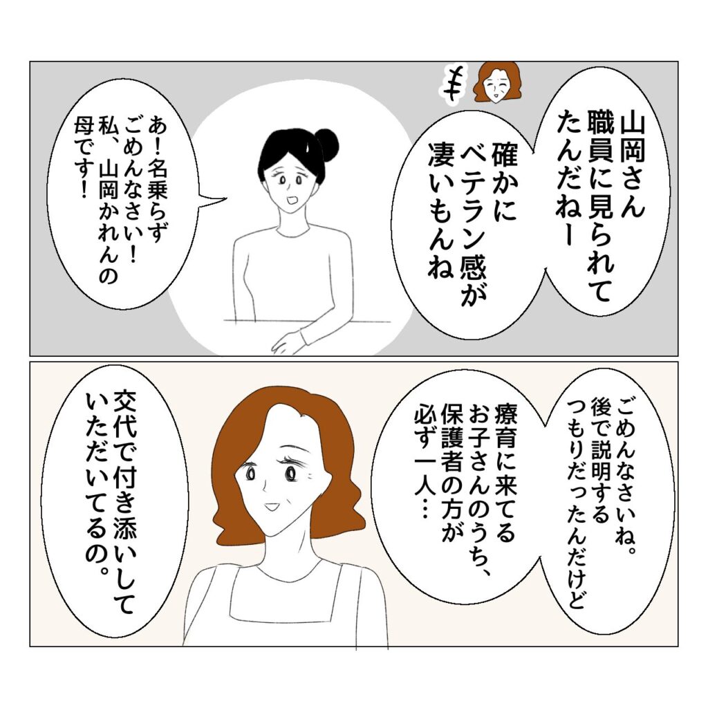 親も療育の勉強になるし、我が子の小集団における様子も見れるし、先生から子どもに対してどのような接し方をしているのか監視になるし、先生も親がどんな人なのかわかるしで…。さらに10回に一回(週2の通所だと1か月に一回程度)くらいの負担なので、それ以外は親は一人になる時間も確保でき、休息したり仕事したり家事等できるのも素晴らしいなと思いました。