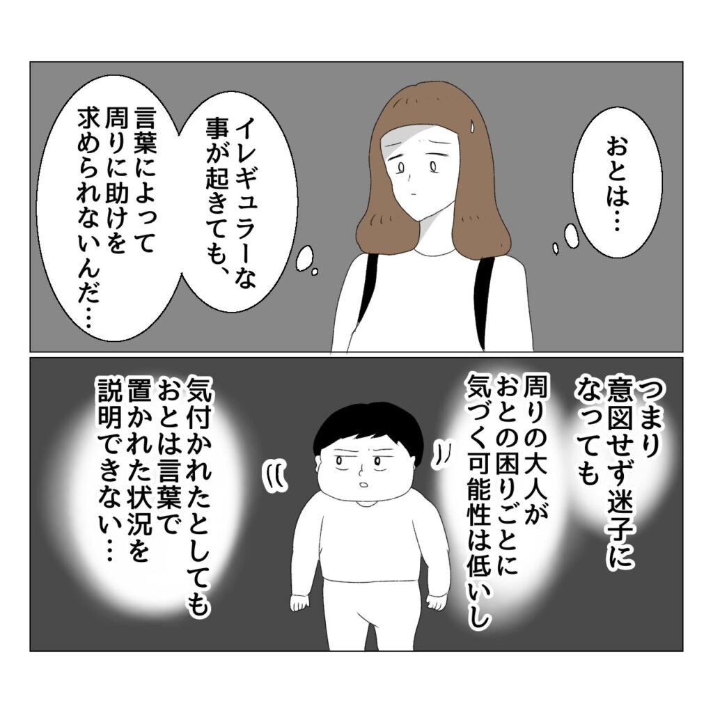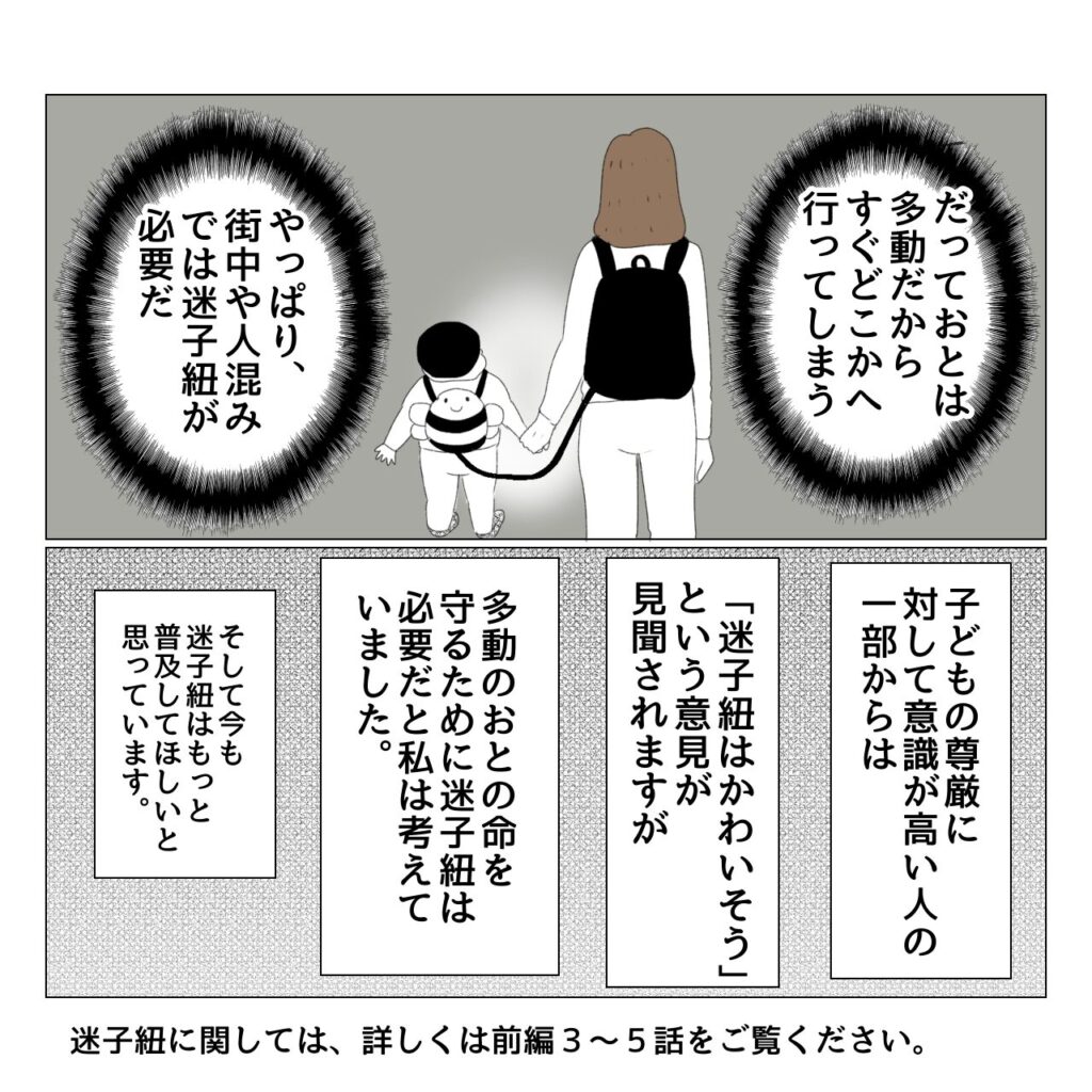なので、当時はおとのリュック型迷子紐の紐を私のリュックにくくりつけ、おとのリュック内の名前カードに、特性や私の携帯番号を書いていました。