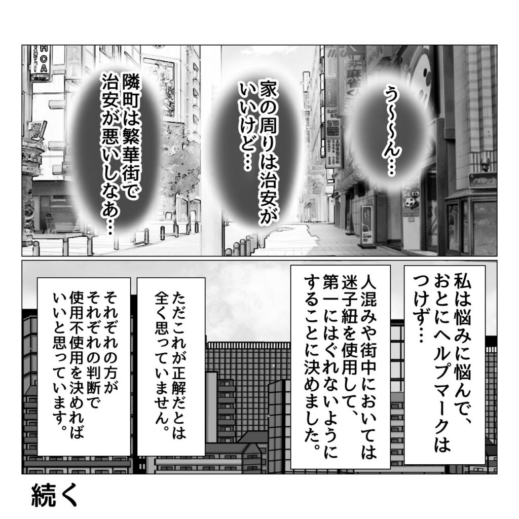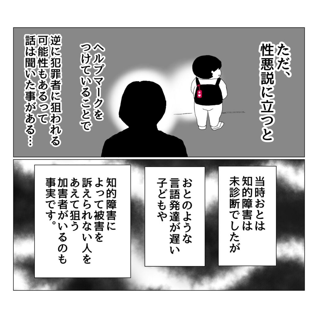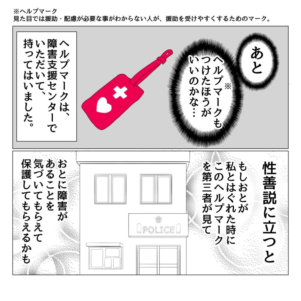 マークの裏側に特性や親の連絡先が記入できるような私製のヘルプマークが販売されているのも知っているのですが、それが変質者に認識されたらより怖い…と思ってしまい、購入には至らずでした。