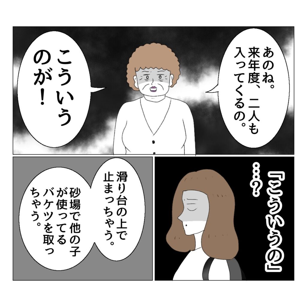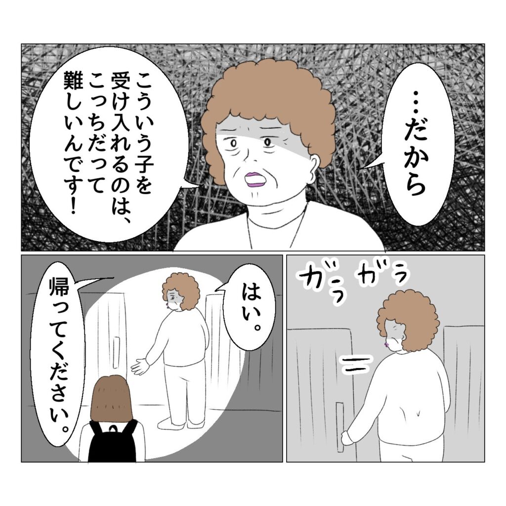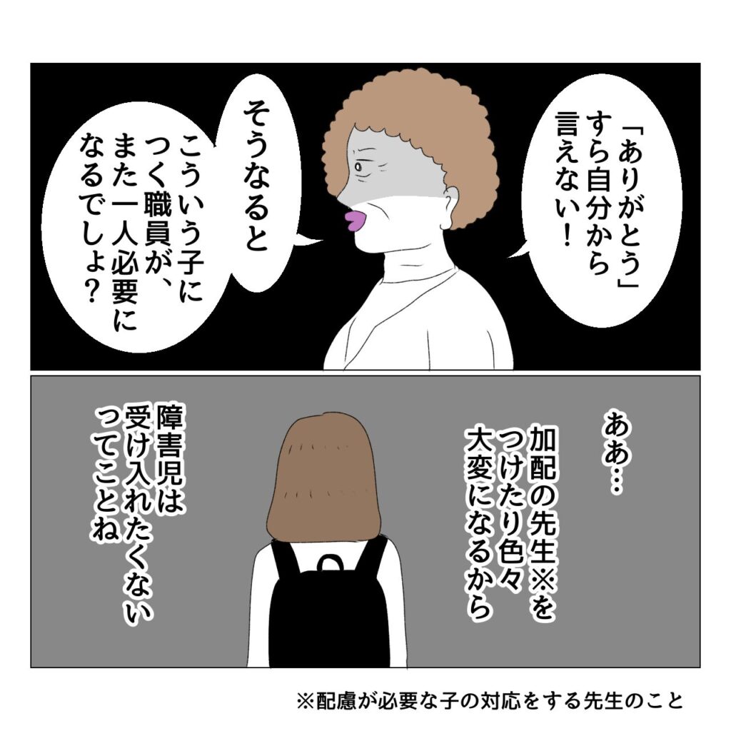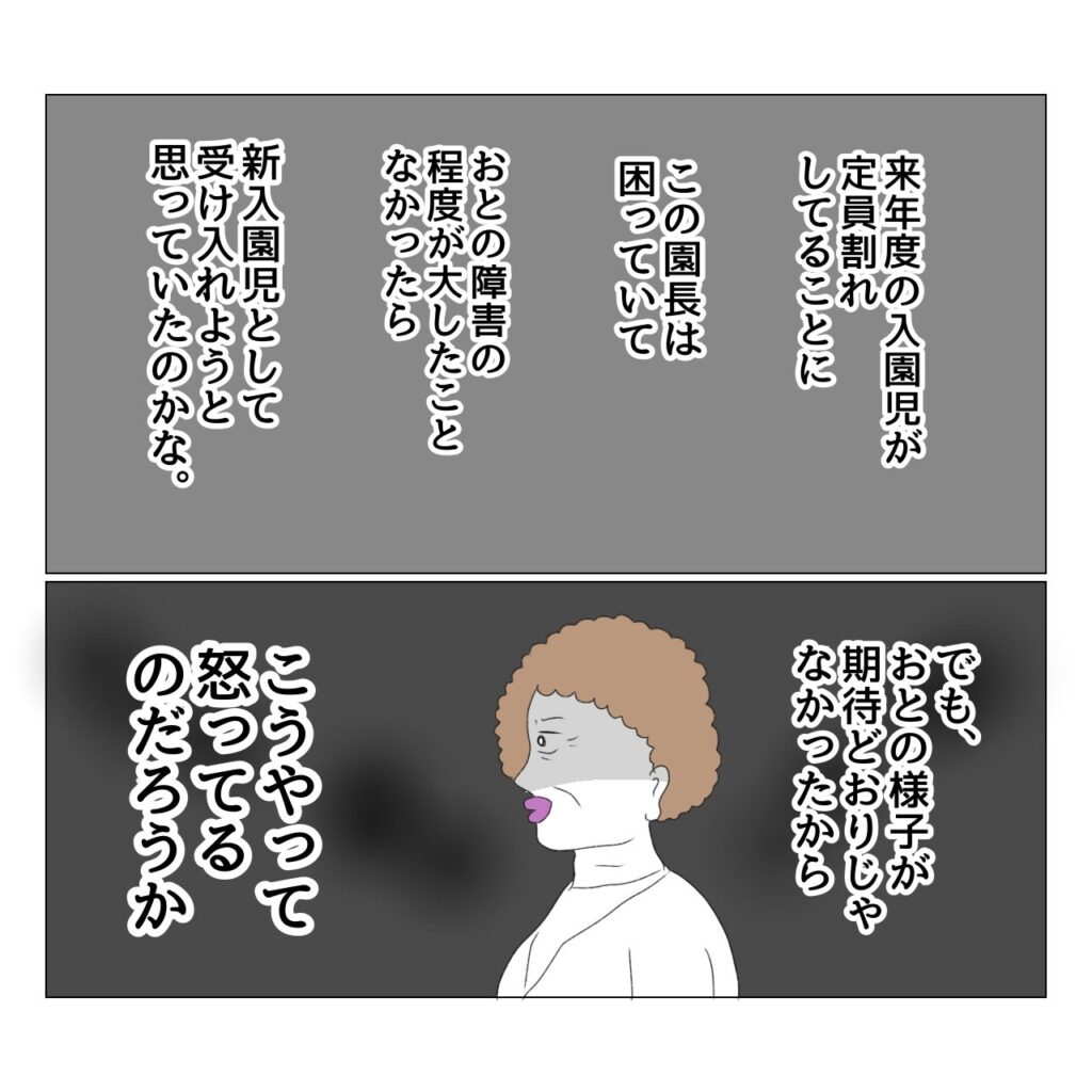 園長先生は、来年度の入園児が少ないイライラ、来年度の入園児の中に既に配慮が必要な子が二人もいるイライラ、おとが自分の期待通りの子ではなかったイライラを抱えていたのでしょう。