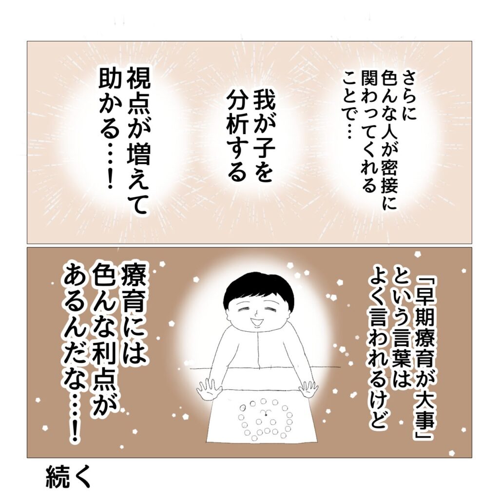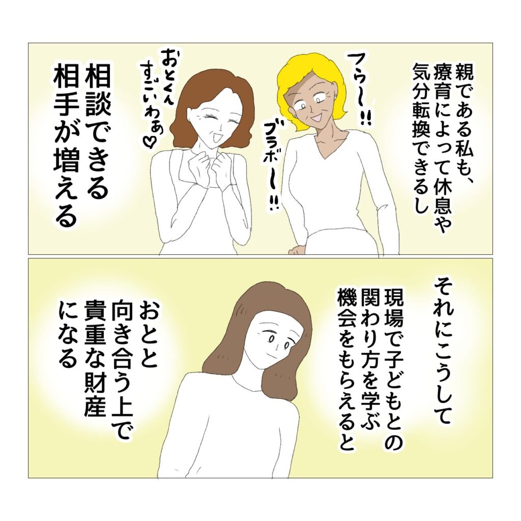 親は支援によって休息・仕事・きょうだいと児の時間がとれたり(分離の場合)、相談先(先生、同じ境遇のママ友など)ができ、心に余裕が生まれます。また、障害児や発達凸凹児への接し方を学べる機会も生じます。