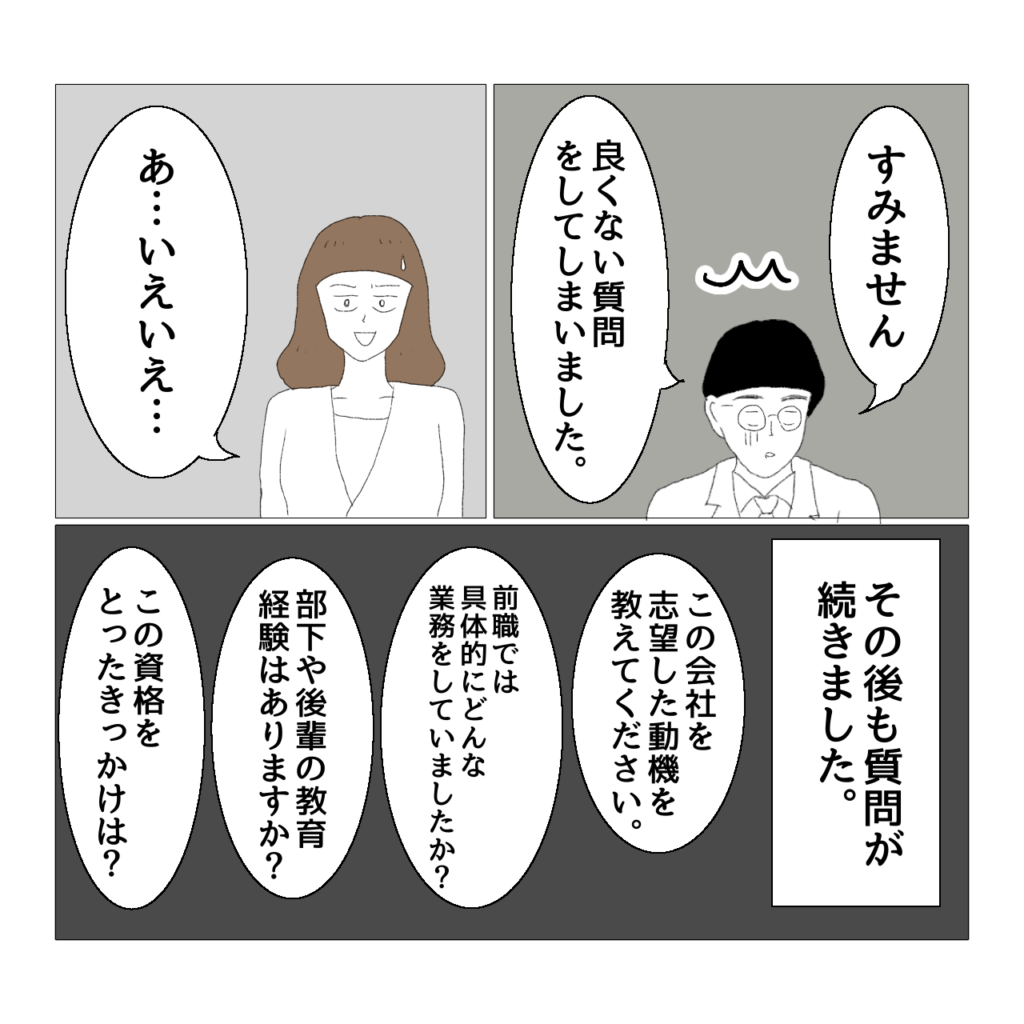 など、前職に関することや仕事に対する姿勢に関する質問が多く驚きました。ちなみに前職は別にそんなたいそうな仕事ではなく普通の事務です。