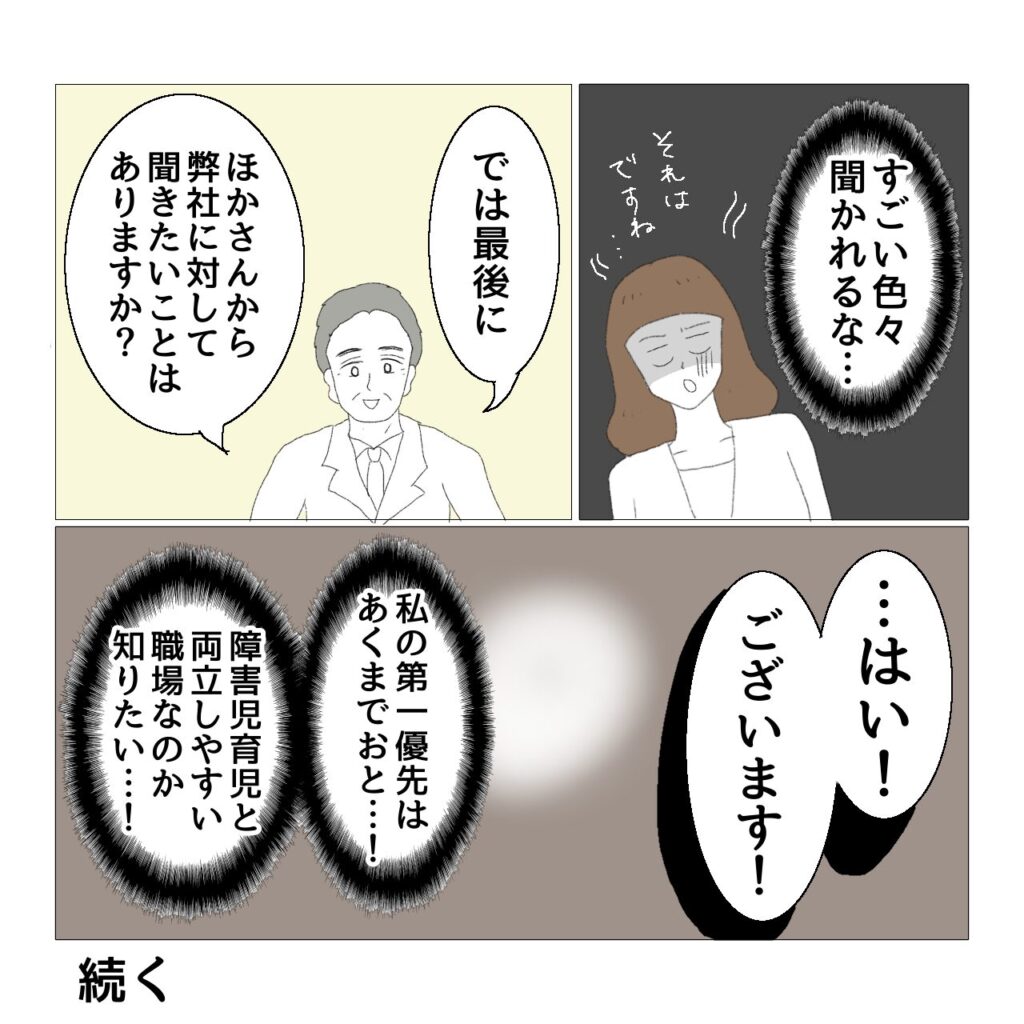 でも、会社側が色々掘り下げて質問してくれたので、私もおとの育児との両立について確認しやすい雰囲気になり、よかったです。それは次回に続きます…!!