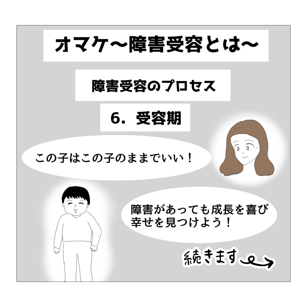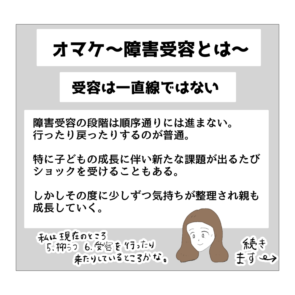 そして私は【5.抑うつ期】と同時に現在【6.受容期】にもいると思っています。私が受容期に入ったのはおとが小学校に入って以降のような気がします。支援学級で適切な支援を受けられるようになり、進路もなんとなく見えてきて、おとの障害特性が落ち着き、さらに親への愛着が見られるようになって…という状態になり、ようやく受容できたと思います。でもずっと受容期にいるわけではく【5.抑うつ期】と行ったり来たり、1日の中でもおとと過ごしている時は受容しているけど、夜寝る前にふと抑うつになったりする…という感じです。