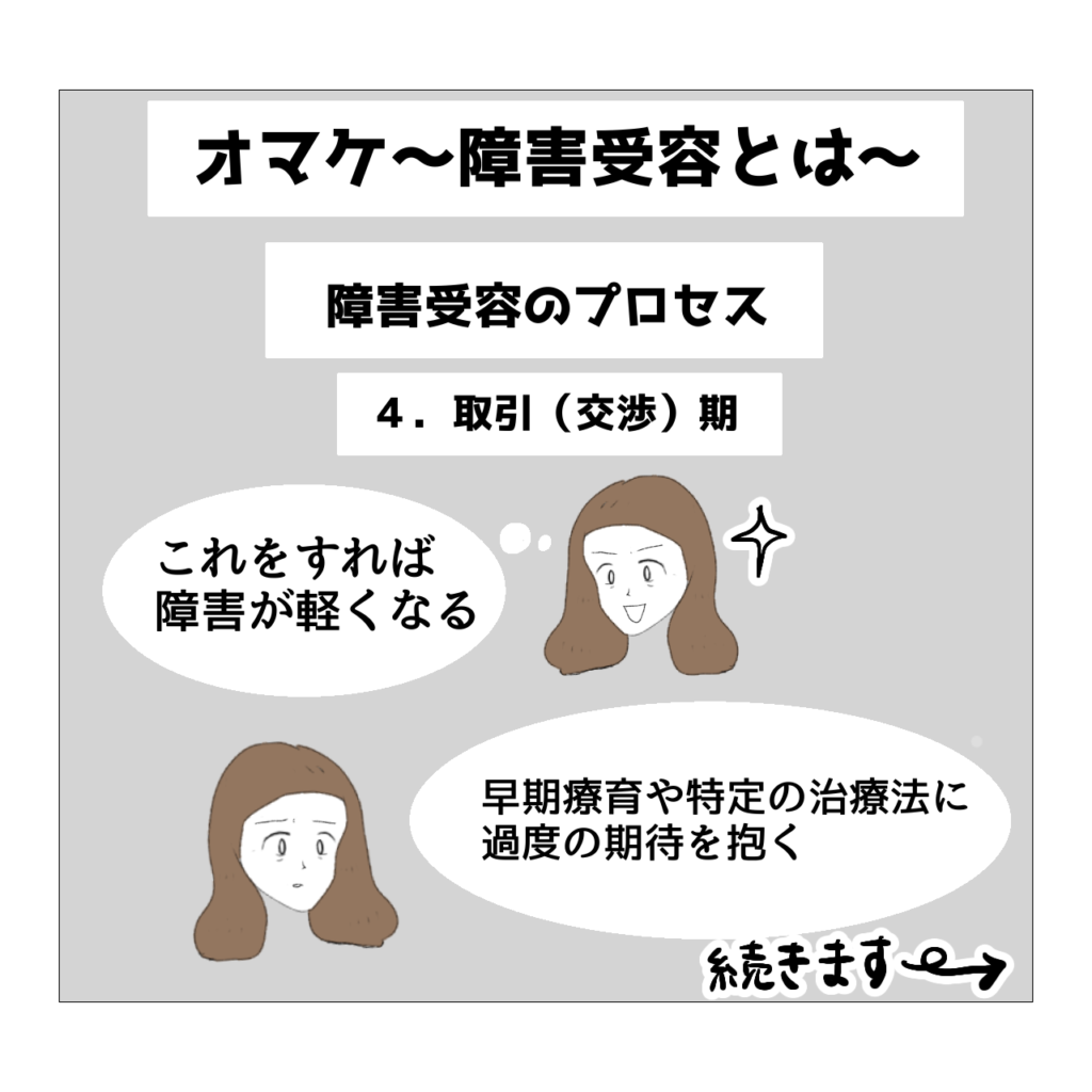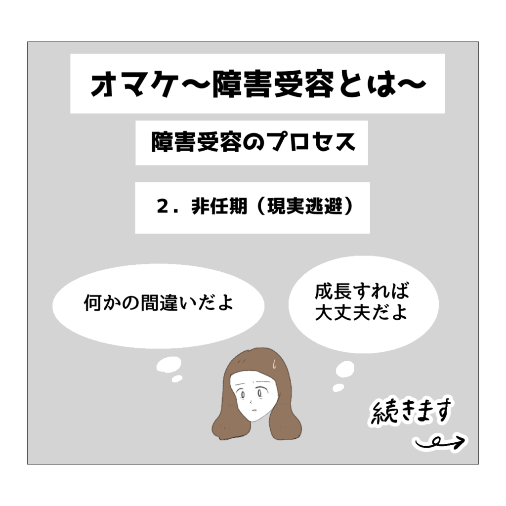 この否認期に悪影響を及ぼすのが、周囲の人の「謎理論」だと思います。「謎理論」とは私が勝手にそう呼んでるだけなんですけど、「うちの子(知り合いの子)もずいぶん心配したけど障害はなかったから、あなたの子もきっとないよ」という謎の励ましのことです。この否認期にこういった謎理論による励ましを受け続けると「やっぱりうちの子は大した問題はないんじゃないか?」という思いが加速しがちになるように思います。