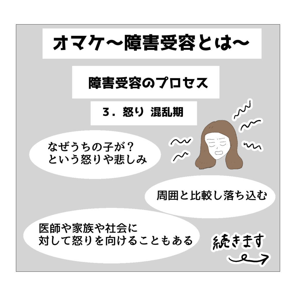 私は多分今後【1.ショック期】【2.否認期】【4.取引・交渉期】に戻ることはないと思うのですが【3.怒り・混乱期】はこれからも色々なタイミングで到来するんだろうなあと思っています。ただ、そんな時にもこの障害受容のプロセスを思い出し、「ああ今自分は今【3.怒り・混乱期】にいるな…」と自分を俯瞰して見れていれば、少しは気持ちが楽になると思っています。そして大切なのは、無理に受容しなくても良い、受容できない自分を責めなくて良い、ということを知っておくことだと思います。