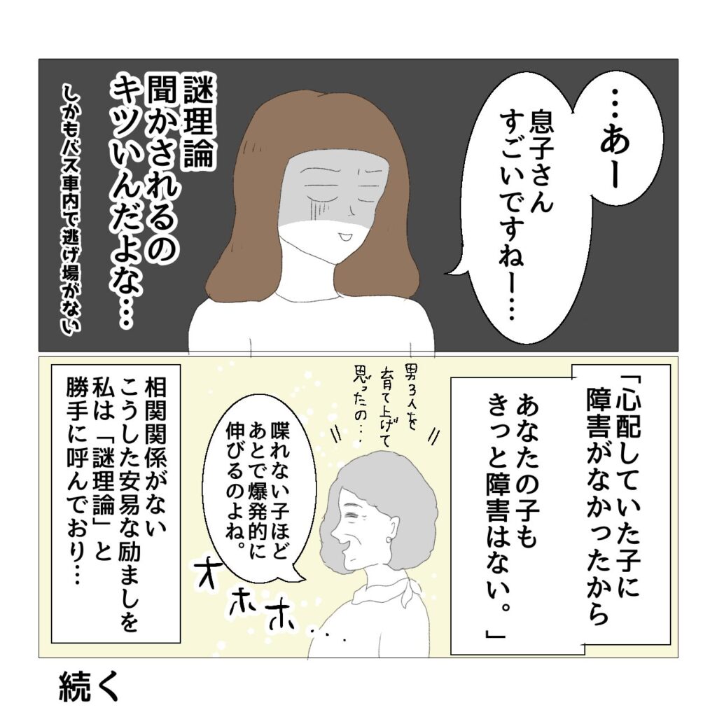 私はこの漫画の時点(3歳年少頃)では謎理論をもうほとんど信じていませんでしたが、まだ診断がつく前だったり診断がついてまもなくの時期(1~2歳頃)は謎理論にわりと翻弄されていました。また、3歳以降でも「おとに似た子を知っているけど結局障害はなかった」という類の、「おとに似ている全く知らない子」についての謎理論には翻弄されていました。
