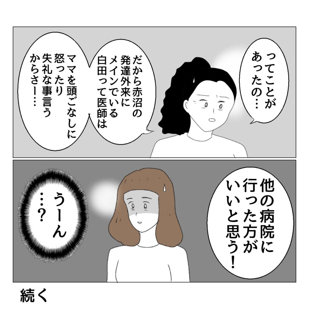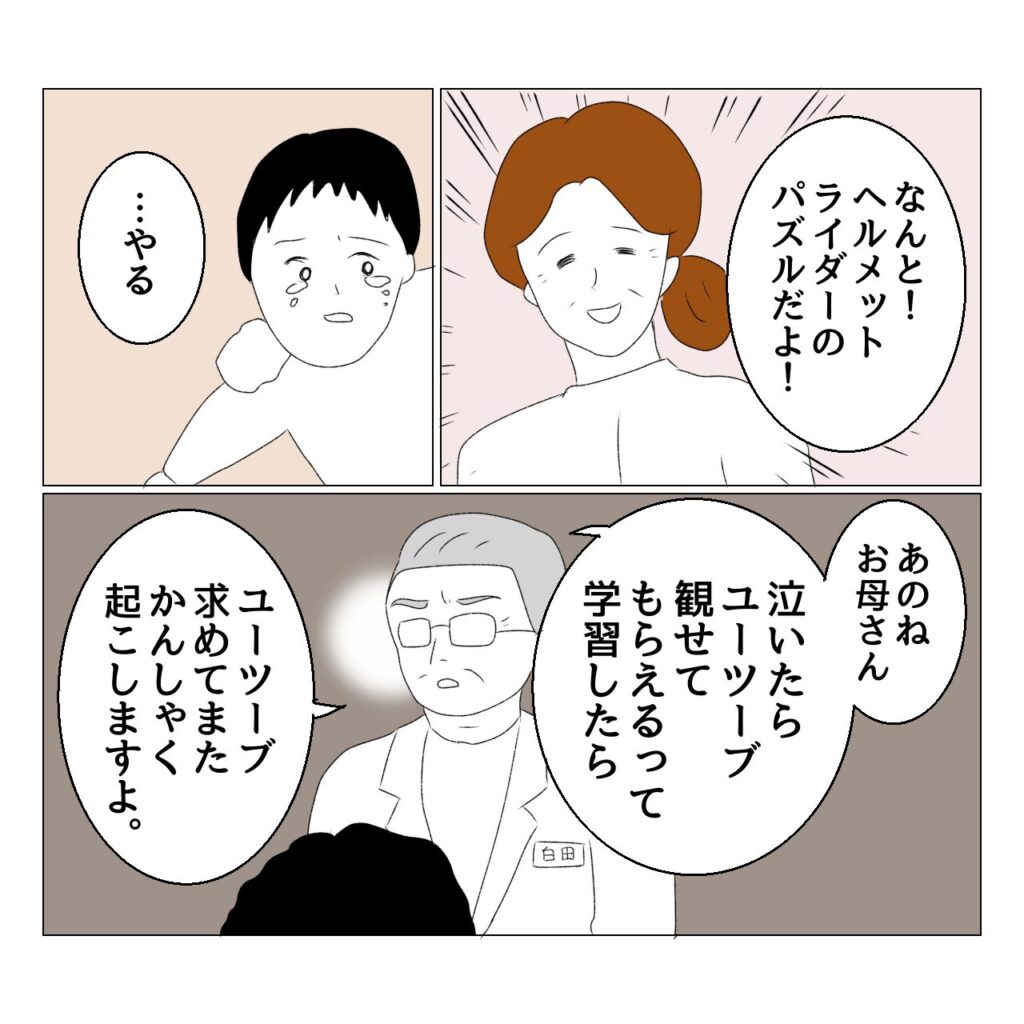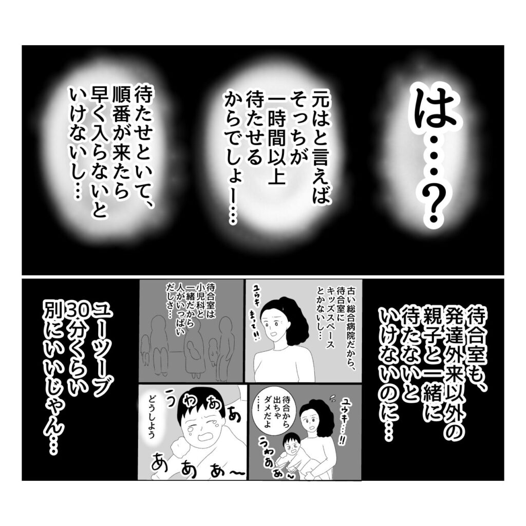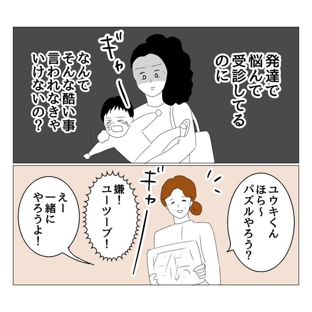 この時ユウキ君ママが抱いた気持ち「じゃあどうしたらいいのよ」を、先生にぶつければ良かったんだと思いますが、医師に対して萎縮してしまったり、それまでのユウキくんの癇癪で困り疲れ果てていたりで、もういいやってなってしまったのかなと…。